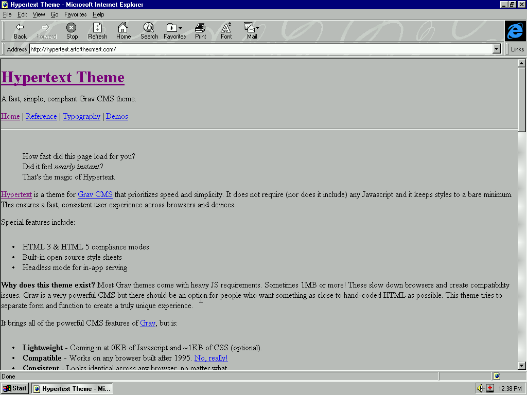 Why does this theme exist? Most Grav themes come with heavy JS requirements. Sometimes 1MB or more! These slow down browsers and create compatibility issues. Grav is a very powerful CMS but there should be an option for people who want something as close to hand-coded HTML as possible. This theme tries to separate form and function to create a truly unique experience.